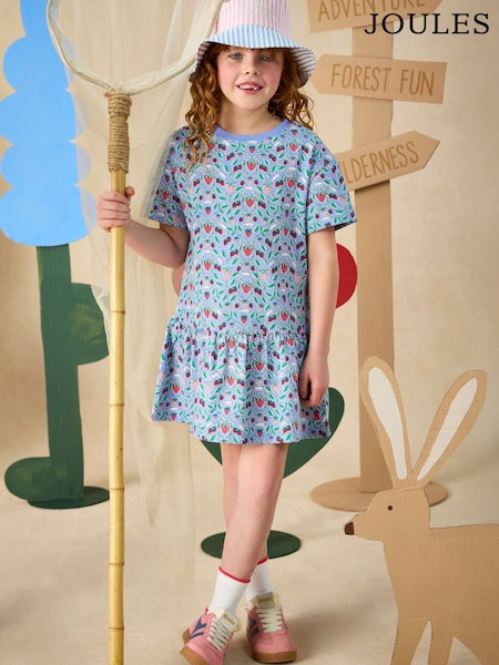 Joules Girls' Sienna Blue Strawberry Short Sleeve Frill Jersey Dress
