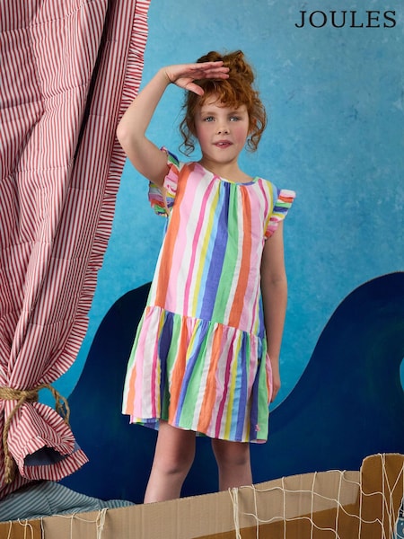 Joules Girls' Laura Multi Stripe Woven Sleeveless Midi Tiered Dress