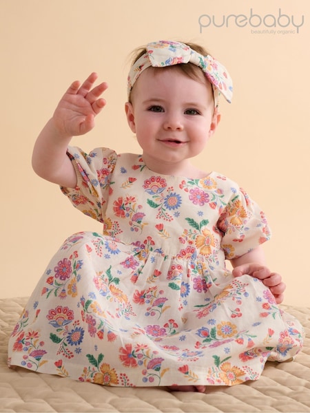 Purebaby Pink Linen Blend Floral Dress and Headband