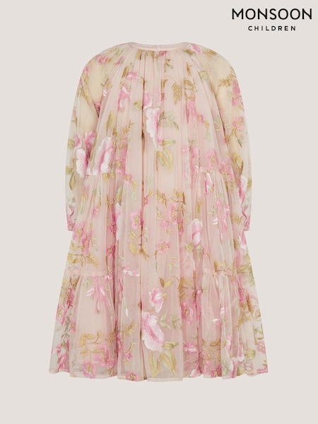 Monsoon Pink Azalea Floral Embroidered Long Sleeve Dress