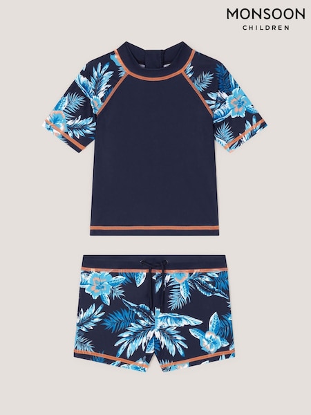Monsoon Blue Tropical Print Rash Vest & Swim Shorts Set