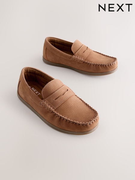 Tan Brown Wide Fit (G) Leather Penny Loafers with Touch and Close Fastening