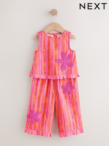 Pink/ Orange Stripe / Crochet Flowers Top & Trousers Set (3mths-7yrs)