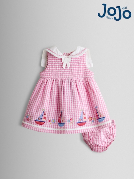 JoJo Maman Bébé Pink Gingham Nautical Embroidered Sailor Baby Dress
