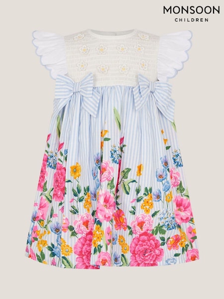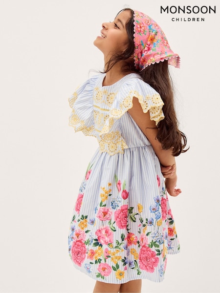Monsoon Blue Floral Stripe Broderie Sleeve Dress