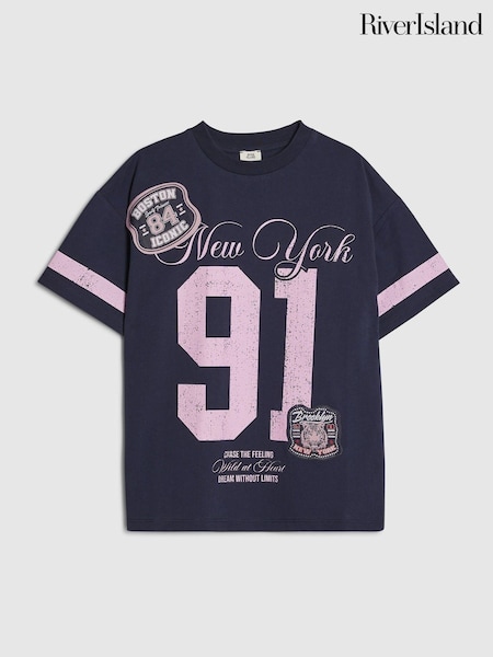 River Island Blue New York 91 Back Print T-Shirt