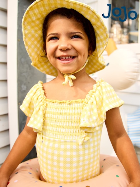JoJo Maman Bébé Yellow Daisy Gingham Textured Frill Sleeve Swimsuit