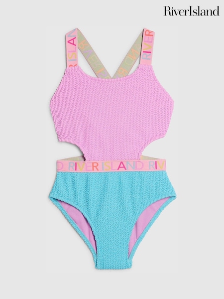 River Island Pink Colour Block Textured Logo Swimsuit