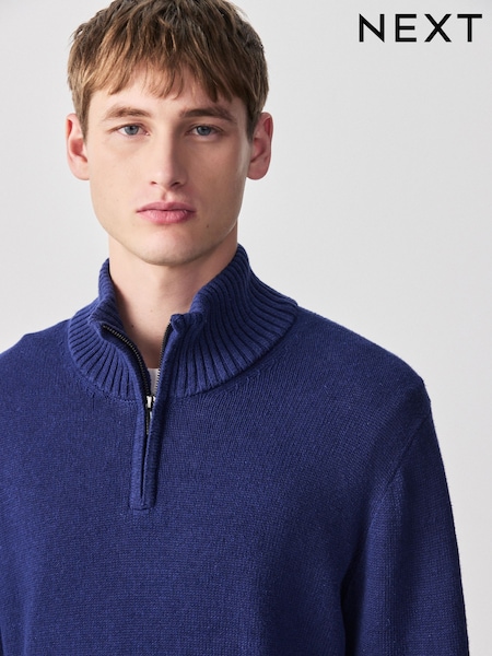 Blue Regular Fit Linen Rich Quarter Zip Neck Jumper