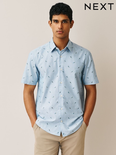 Blue Textured Floral Regular Fit 100% Cotton Short Sleeve Print Shirt