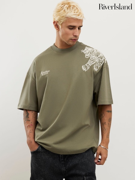 River Island Green Oversized Tiger Embroidered T-Shirt