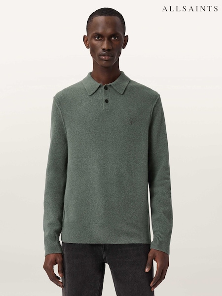 AllSaints Green Mode Merino Long Sleeve Polo Shirt