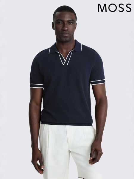 MOSS Blue Contrast Placket Skipper Polo Shirt