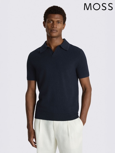 MOSS Navy Merino-Blend Zip Neck Polo Shirt