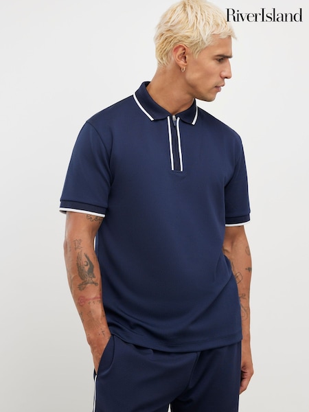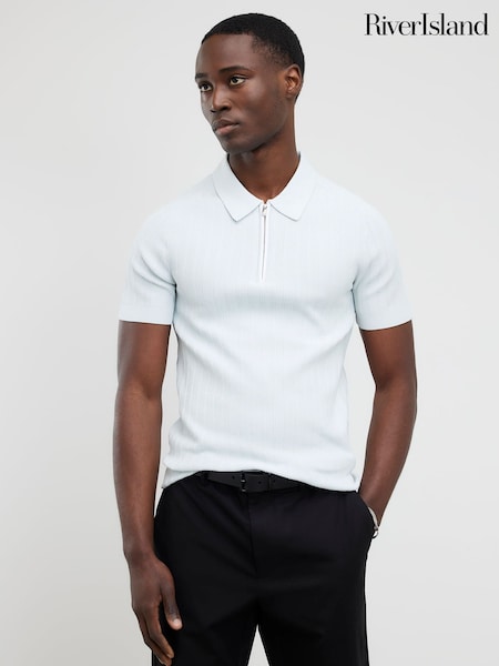 River Island Blue Slim Fit Textured Zip Polo Shirt