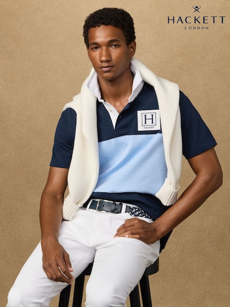 Hackett White Heritage Long Sleeve Stripe Rugby Badge Logo Polo Shirt