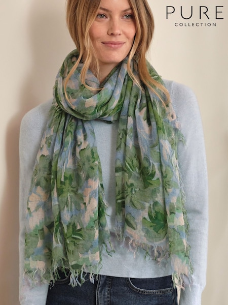 Pure Collection Green Ultrafine Cashmere Lightweight Fringed Scarf