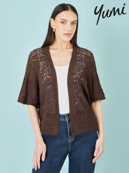 Yumi Brown Crochet Edge To Edge 3/4 Sleeve Cardigan