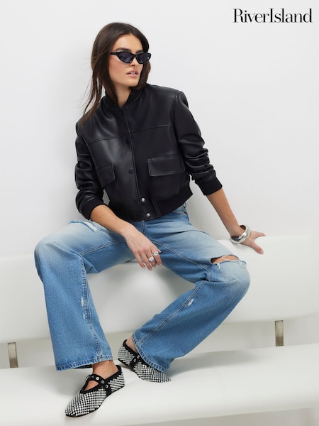 River Island Black Faux Leather Cropped Bomber Jacket
