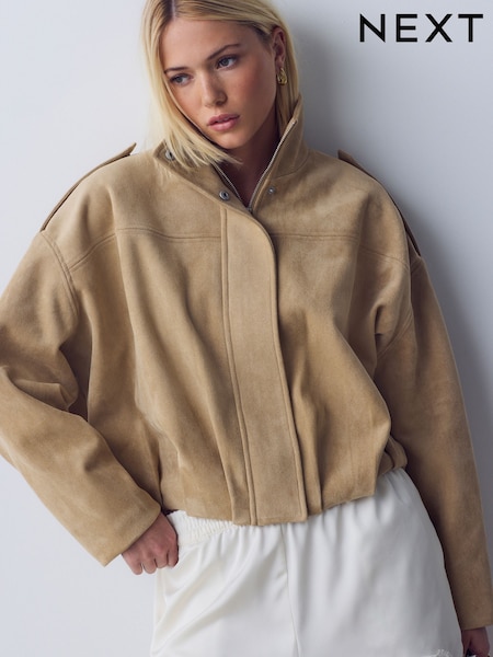 Tan Brown Faux Suede Funnel Neck Bomber Jacket