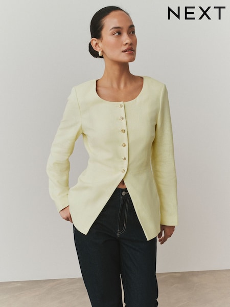 Lemon Yellow Linen Rich Herringbone Collarless Jacket