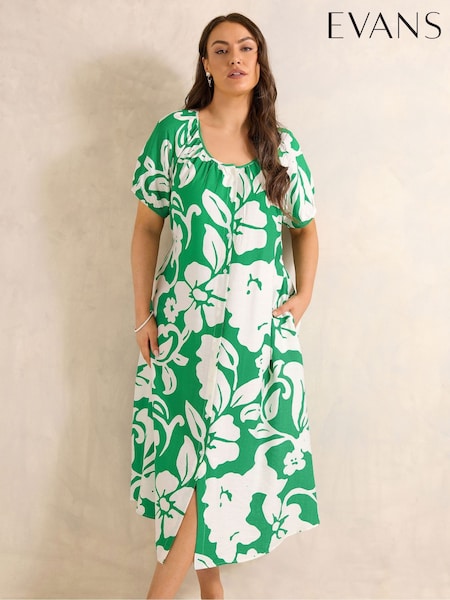 Evans Green Linen Blend Shirred Waist Midi Dress