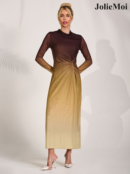 Jolie Moi Brown Petite Long Sleeve Mesh Maxi Dress