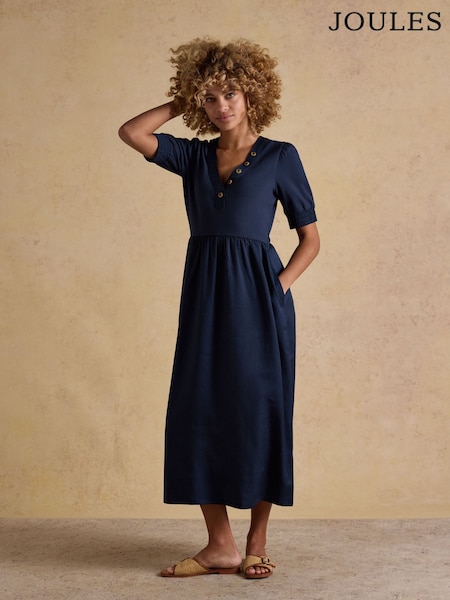 Joules Ivy Navy Shirred Jersey Woven Midi Dress With Broderie Sleeve Detail