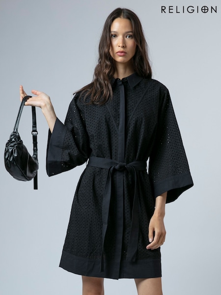 Religion Black Embroidery Anglais Ffion Pretty Tunic Dress With Kimono Sleeve And Tie Belt