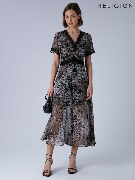 Religion Brown Millie V-Neck Midi Occasion Dress In Animal Print With Lace Inserts