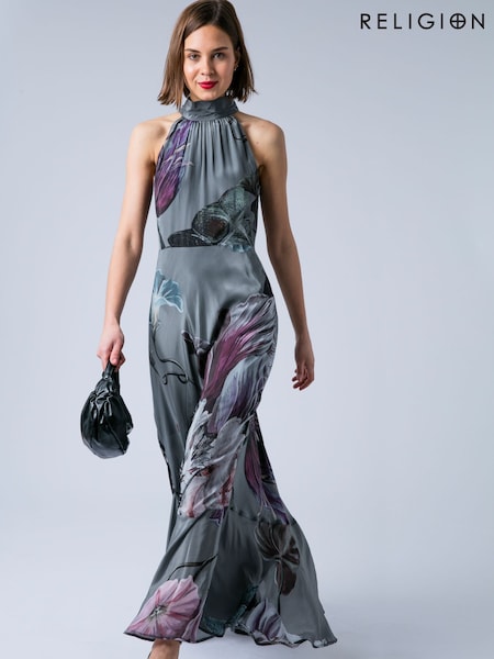 Religion Grey Valeria Maxi Halter Neck Occasion Dress With Large Floral Print