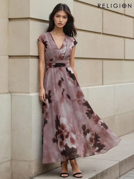 Religion Pink Lilian Maxi V-Neck Occasion Dress With Tie Waist and Stud Neck trim in Ocelot