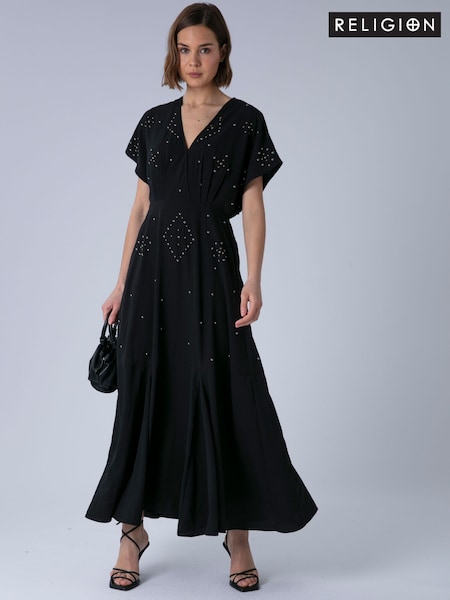 Religion Black Sarah Maxi Boho Occasion Dress With All Over Stud And Embelishment In Silver And Gold