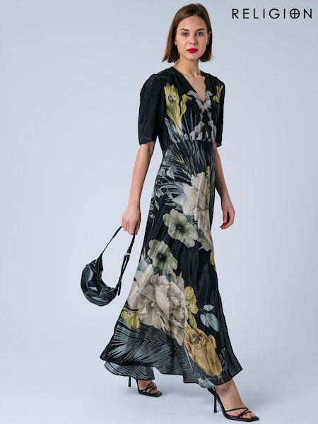 Religion Black/Yellow Short Sleeved Diana Maxi Tea Dress With Large Rose Placement Print In Cupro