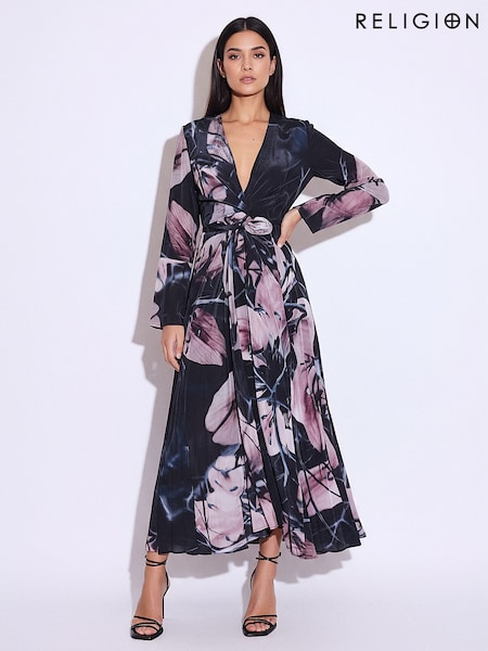 Religion Black Florence Wrap Maxi Dress With Full Skirt In Dark Floral
