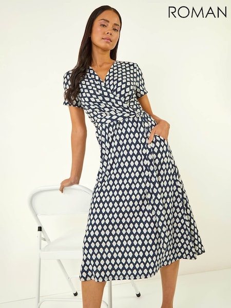 Roman Blue Petite Geometric Tie Waist Wrap Dress
