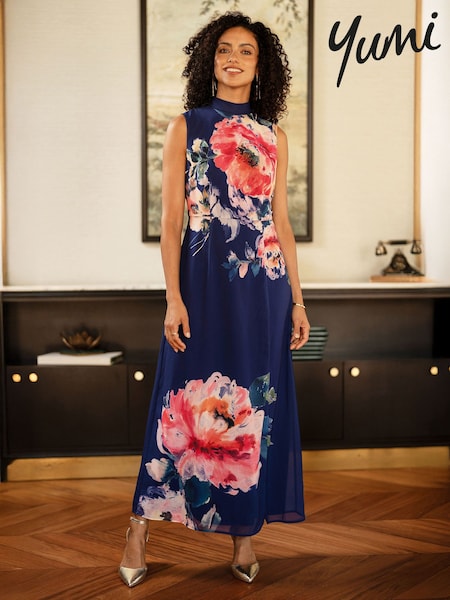 Yumi Blue Mirror Floral Print Maxi Halter Neck Dress