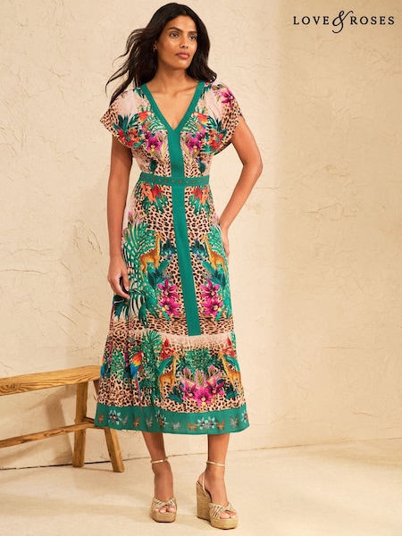 Love & Roses Khaki Green Animal Sequin Trim Square Neck Midi Dress