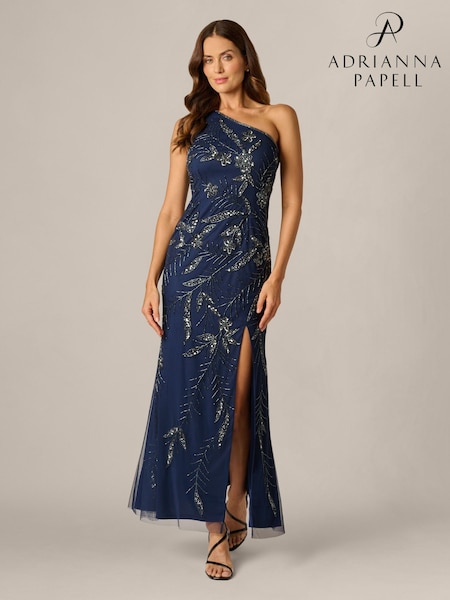 Adrianna Papell Blue Studio Bead Mesh Long Dress