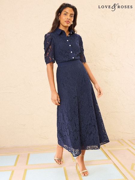 Love & Roses Navy Collared Lace Embellished Button Up Midi Dress