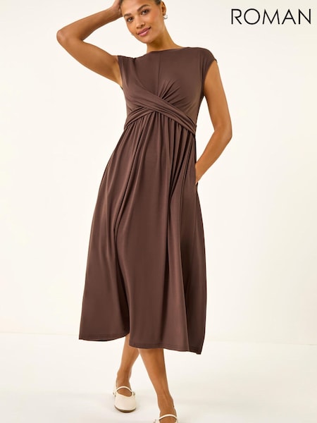 Roman Brown Cross-Over Front Stretch Midi Dress