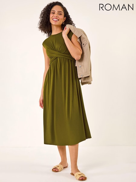 Reiss Green Pari Ruched Sleeveless Midi Dress With Linen
