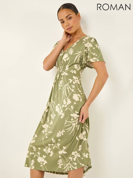 Roman Green Floral Leaf Print Midi Shirt Dress