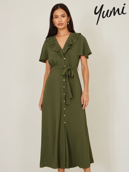 Yumi Green Ruffle Collar Midi Shirt Dress