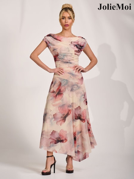 Jolie Moi Natural Asymmetrical Draped Mesh Maxi Dress