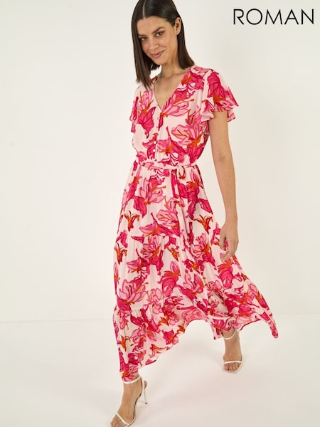 Roman Red Floral Tiered Tie Waist Midi Dress