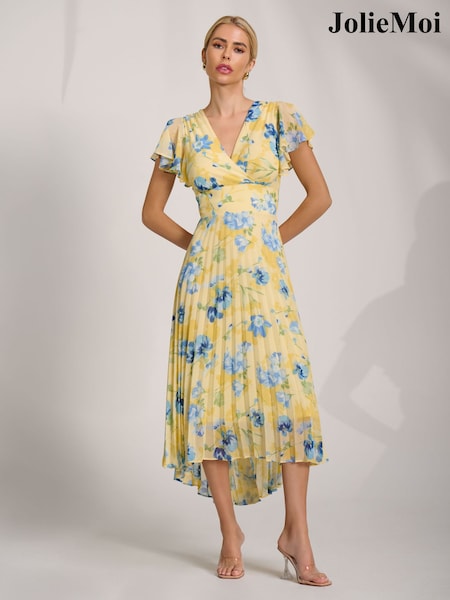 Jolie Moi Yellow Chiffon Ruflle Sleeve Pleated Maxi Dress