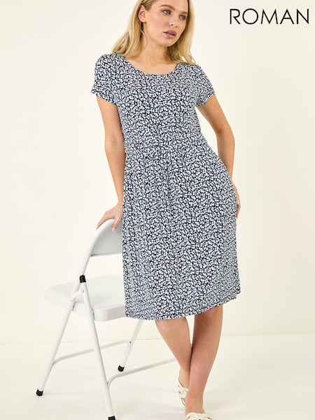 Roman Blue Ditsy Floral Print Pocket Stretch Dress