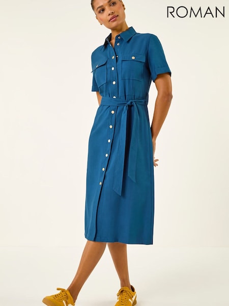 Roman Blue Button Belted Collared Shirt Dress