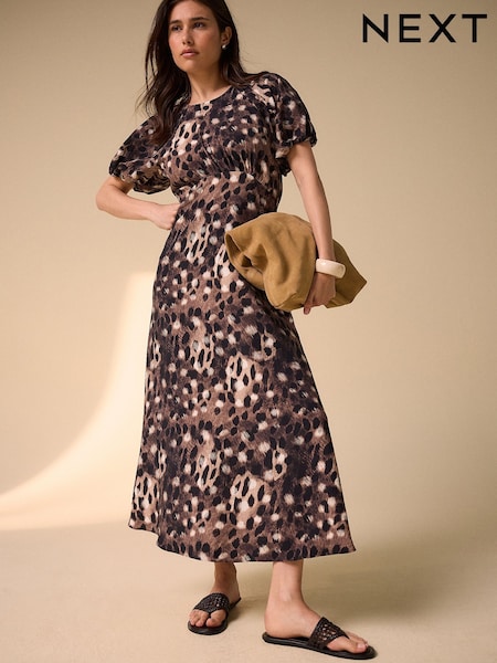 Animal Print Puff Sleeve Midi Dress
